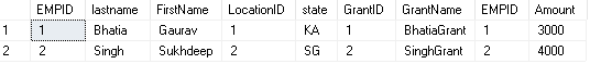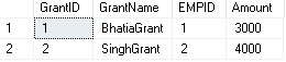 (GrantID INT Primary key ,GrantName Varchar(15) NOT Null,EMPID INT Not null , Amount INT Not null ,)