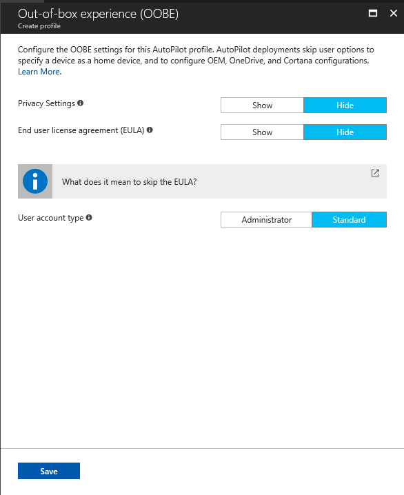 The thinking behind the Autopilot program is that users can take delivery of their new Windows 10 devices and join it to the Azure Active Directory in a matter of minutes without having to complete all the time consuming setup screens which makes the life easy for Admins and users. Also the user does not have to end up being a local administrator on the device, as used to be the case with manual Azure AD Join.