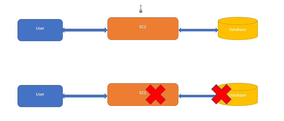 In the image below you can see if any component goes down, then connection is broken leading to downtime and dissatisfied users. To get around this situation we need to have Loose coupling , which we can achieve by having redundancy and adding load balancers.